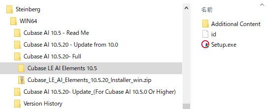 「開く」ボタンを押して、「Cubase AI 10.5.20- Full」フォルダの「Cubase_LE_AI_Elements_10.5.20_Installer_win.zip」を解凍します。